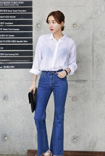 材质轻薄的白衬衫,带来微微的透视效果,增添小性感,搭配喇叭造型的牛仔裤,颇有复古韵味,这样穿显得格外高挑,气质也十分出众。
